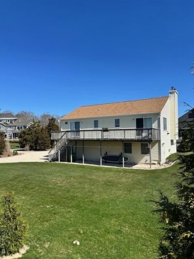 Steps to Tiana Bay where you can launch your kayak & paddleboard as well as walk to the Private Beach for relaxation. Enjoy the waterviews of Tiana Bay form the deck which overlooks the Manicured Grounds with Sprinkler System. Built for scenic enjoyment with waterviews form the Kitchen with Dining area Cathedral Ceiling and Waterview's from the Primary Bedroom that includes a Full Bathroom and Walk in Closet. There are 2 Guest Bedrooms, Main Bathroom, Living Room with Fireplace and Cathedral Ceiling, Full Basement, which is Paritally Finished, Laundry and 1 Car Garage. Plenty of Parking for Guests with the Circular Stone Driveway with Belgium Block Border. There is also a Stone Patio Area under the Deck. The Roof is approximately 4 Years Old, and the Oil Tand has been replaced.